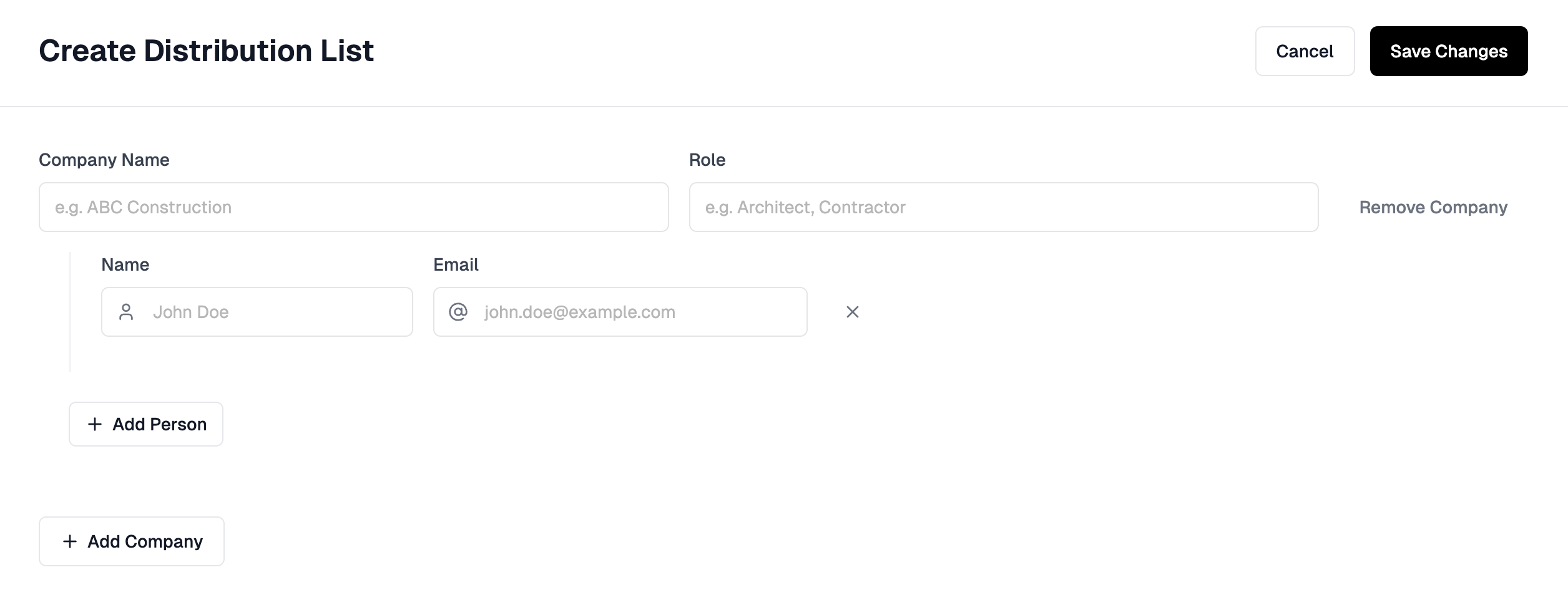 - Add stakeholder information — Enter the company information for the first stakeholder and relevant team members. For example, the architects may have assigned 2 team members to this project, so you can add both of their names and emails to your distribution list.