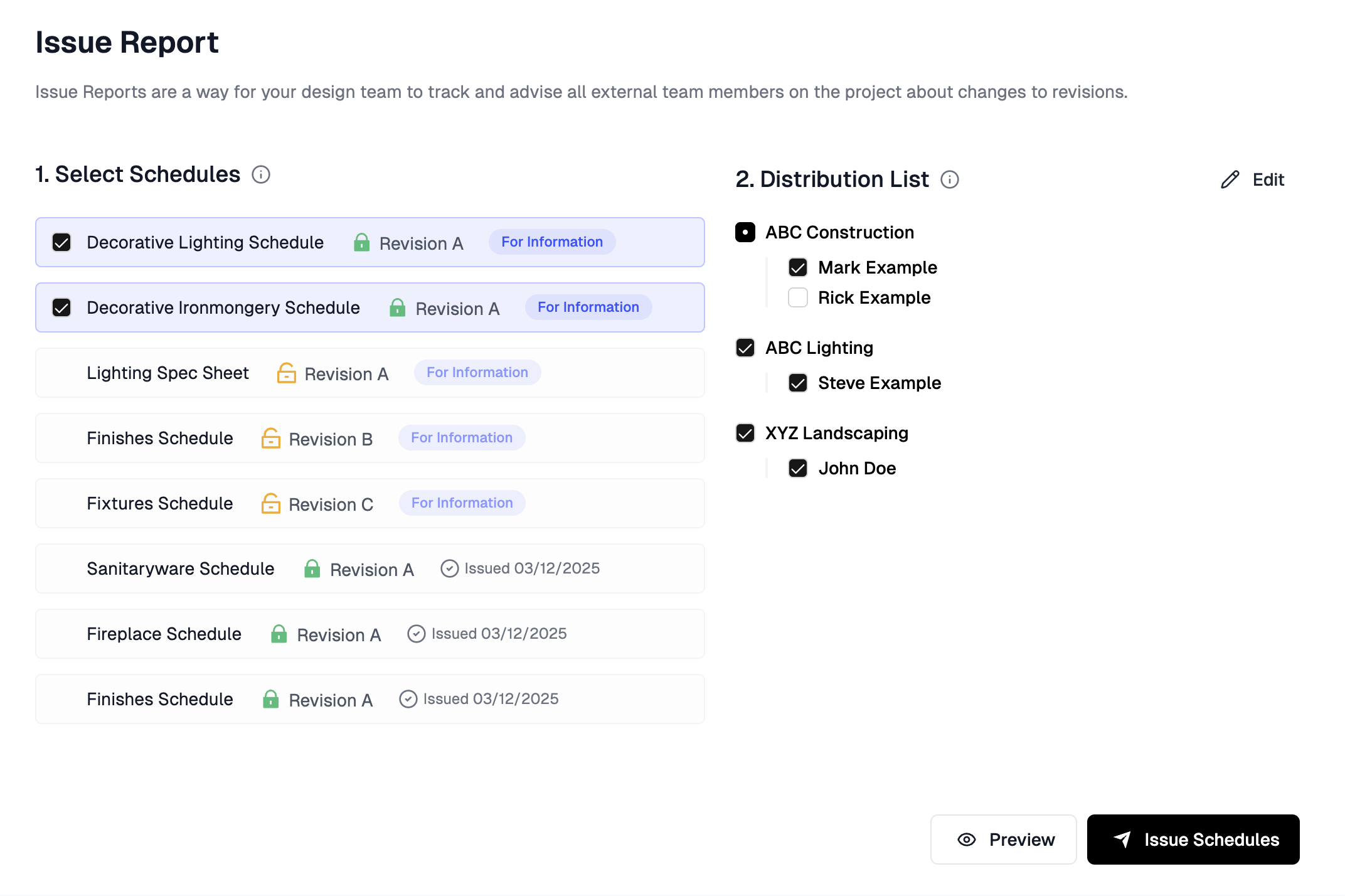 - Preview your Issue Report — You can preview your Issue Report sheet by clicking the preview button in the bottom right corner of your screen. Issue Report sheets advise the date, the status and revision of each schedule that will be sent out.