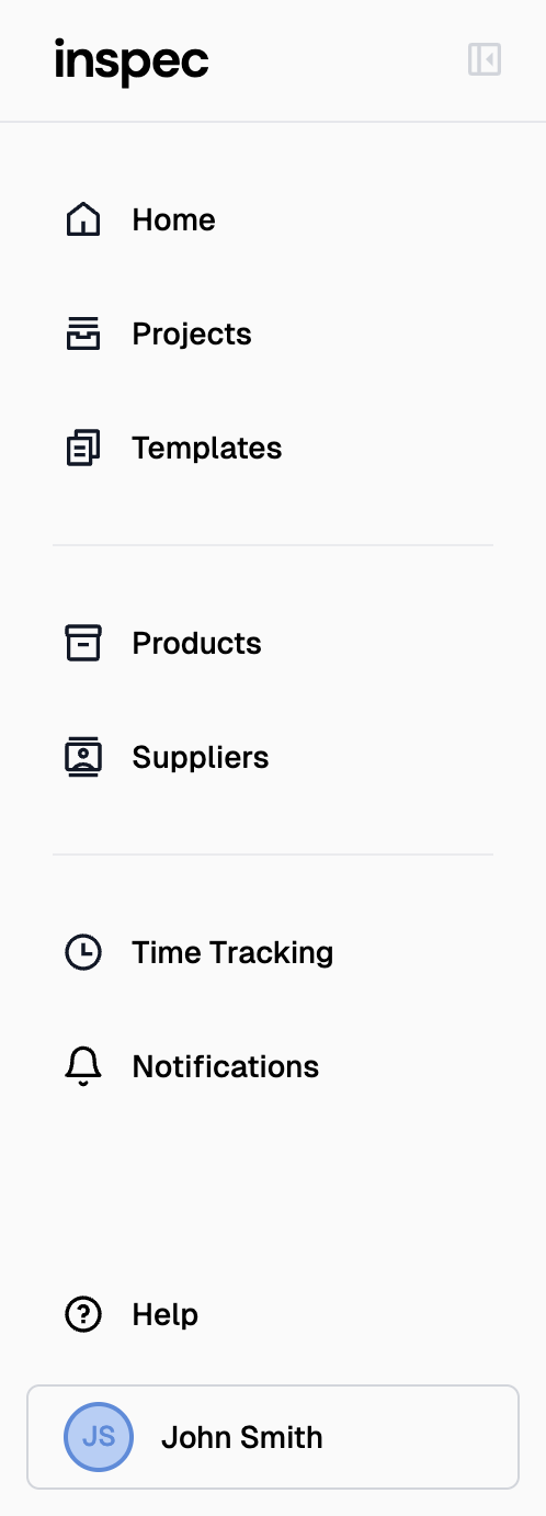 The side bar is where you can navigate to your projects & schedules, templates, products, suppliers, time tracking and user/company settings, as well as access your notifications.
