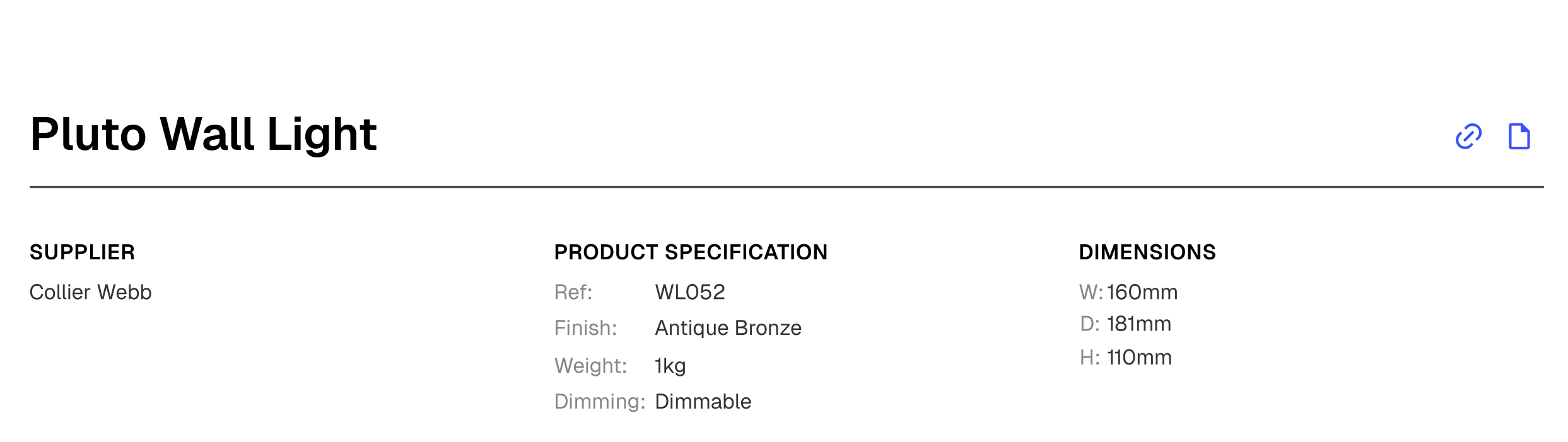 If you've added attachments to a product in your catalogue, these will automatically be linked to the spec sheet generated from that product. This is a convenient way to provide contractors and consultants with relevant technical drawings, installation guides, or other product documentation. Recipients can easily access attachments from the exported PDF by clicking on the document icon next to the product name, which allows them to download the files directly.