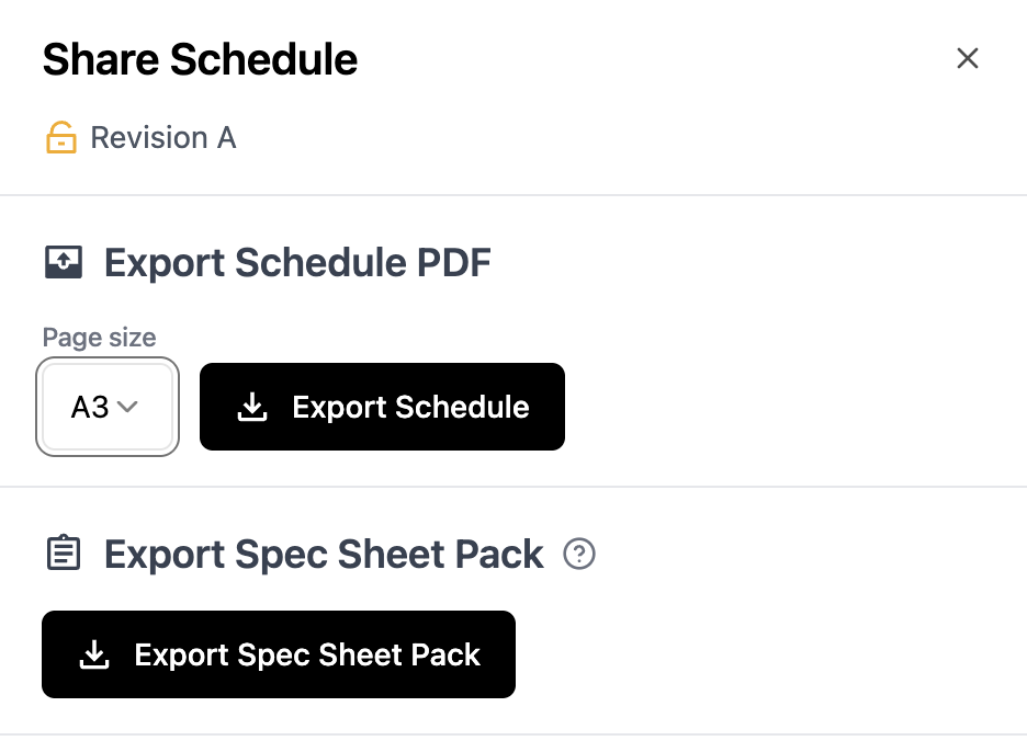 A Spec Sheet Pack is an automatically generated PDF document including all products in your schedules, including a cover page similar to your schedule exports. If you have a schedule with products saved in your product catalogue, you can now produce a professional, combined PDF containing every spec sheet for those products in just one click.