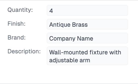 Property fields are particularly useful when you have several related data points that belong together. For example, in a finishes schedule, instead of creating four separate text fields for Quantity, Finish, Brand, and Description — each taking up its own column — you can combine all of that information into a single Property field called "Product Details" as shown below.