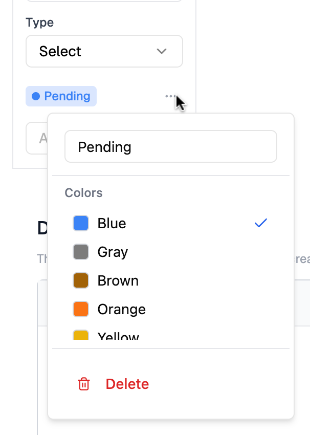 Customise colours — To customise the colour for each select, click the three dots to the right of the confirmed option. Here you can choose a colour, no colour at all, or delete the option.